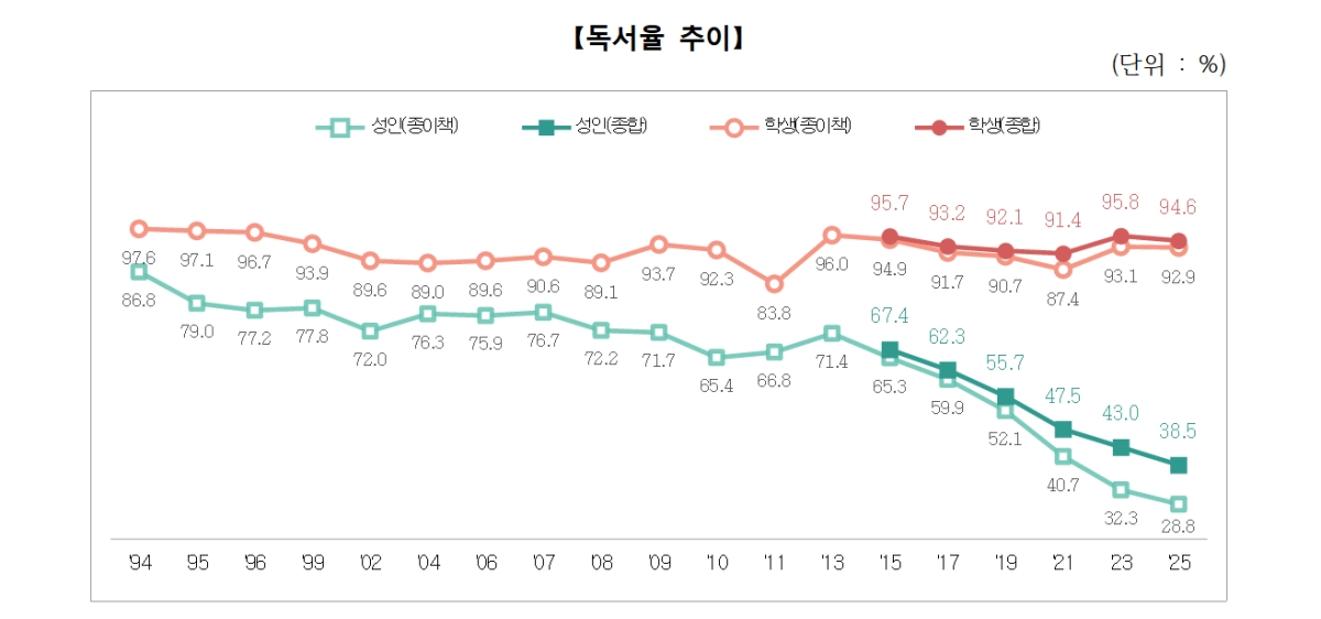 문화체육관광부가 6일 발표한 ‘2025 국민 독서실태조사’에 따르면 지난해(2024년 9월∼2025년 8월) 일반 도서를 단 한 권이라도 읽거나 들은 사람의 비율을 뜻하는 연간 종합독서율이 38.5%에 그쳤다. 10명 중 4명도 책을 안 읽었다는 뜻이다. 이는 2023년(43.0%)보다 4.5%포인트 하락한 수치로, 1994년 독서 실태조사(격년)를 실시한 이래 최저치다.