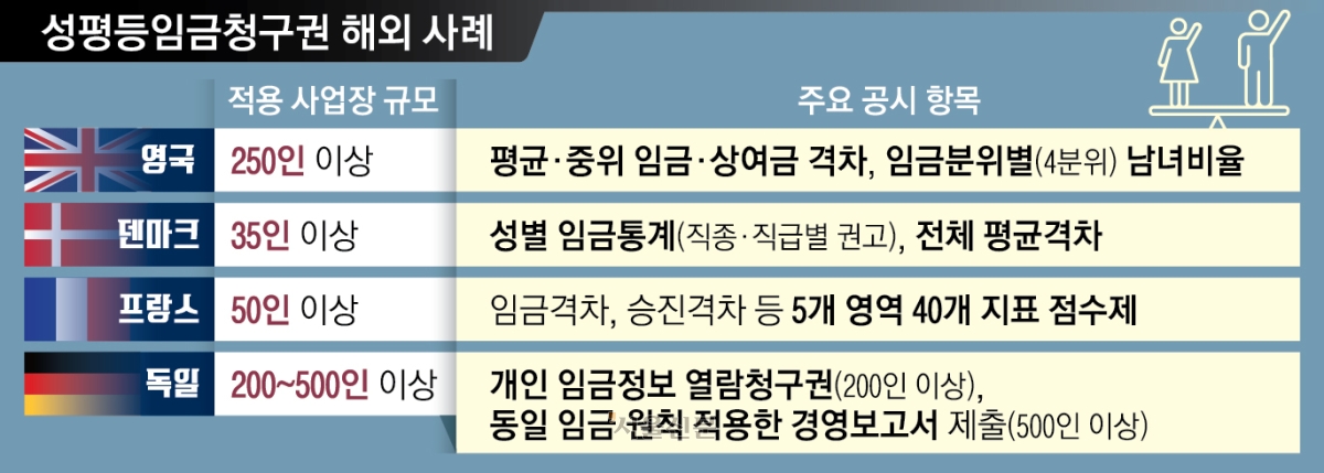 해외에서는 이미 다양한 형태의 성평등임금공시제가 시행 중이다. 영국은 250인 이상 사업장에 평균·중위 임금 및 보너스 격차 등을 매년 공시하도록 의무화했다. 프랑스는 임금 격차와 승진, 육아휴직 복귀율 등을 점수화한 ‘남녀평등지수’를 공개해 점수 미달 기업에 개선계획 제출과 제재를 부과한다. 다만 해당 제도를 시행했을 때 남성 임금 인상률을 낮춰 성별 임금 격차를 줄이는 식으로 부작용이 발생하기도 했다. 일례로 덴마크는 2006년 성별 임금 통계 공개법 도입 이후 3년 뒤 성별 임금 격차가 도입 이전 대비 약 13% 감소했지만, 이는 남성 임금 증가율이 눈에 띄게 줄어든 결과였다.
